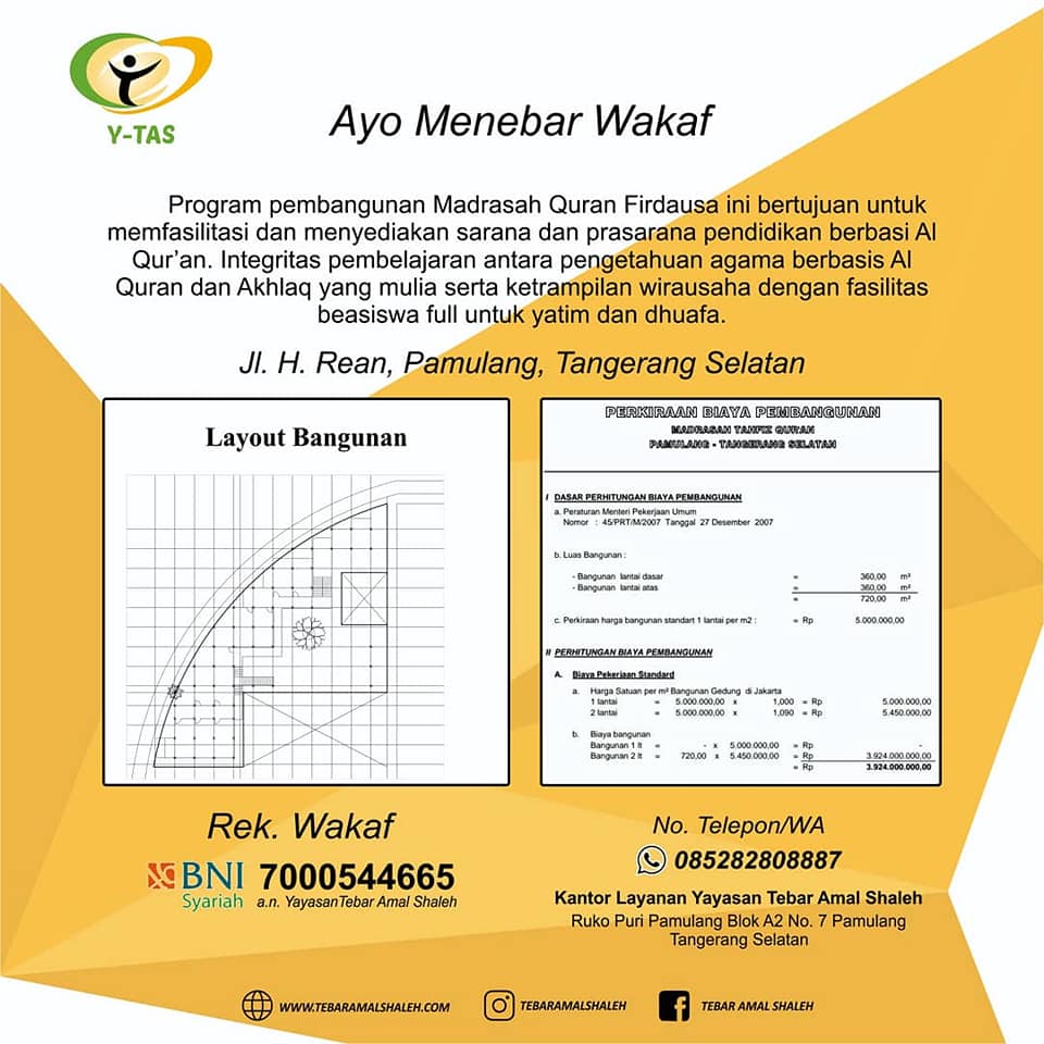 Portfolio Ayo Menebar Wakaf Wakaf untuk pembangunan Madrasah Quran Firdausa. Wakaf Pembangunan Madrasah Quran Program ini bertujuan untuk memfasilitasi dan menyediakan sarana dan prasarana pendidik berbasis Al-Qur’an. Integritas pembelajaran antara pengetahuan agama berbasis Al-Qur’an dan Akhlaq yang mulia serta keterampilan wirausaha dengan fasilitas beasiswa full untuk yatim dan dhuafa. YTAS…